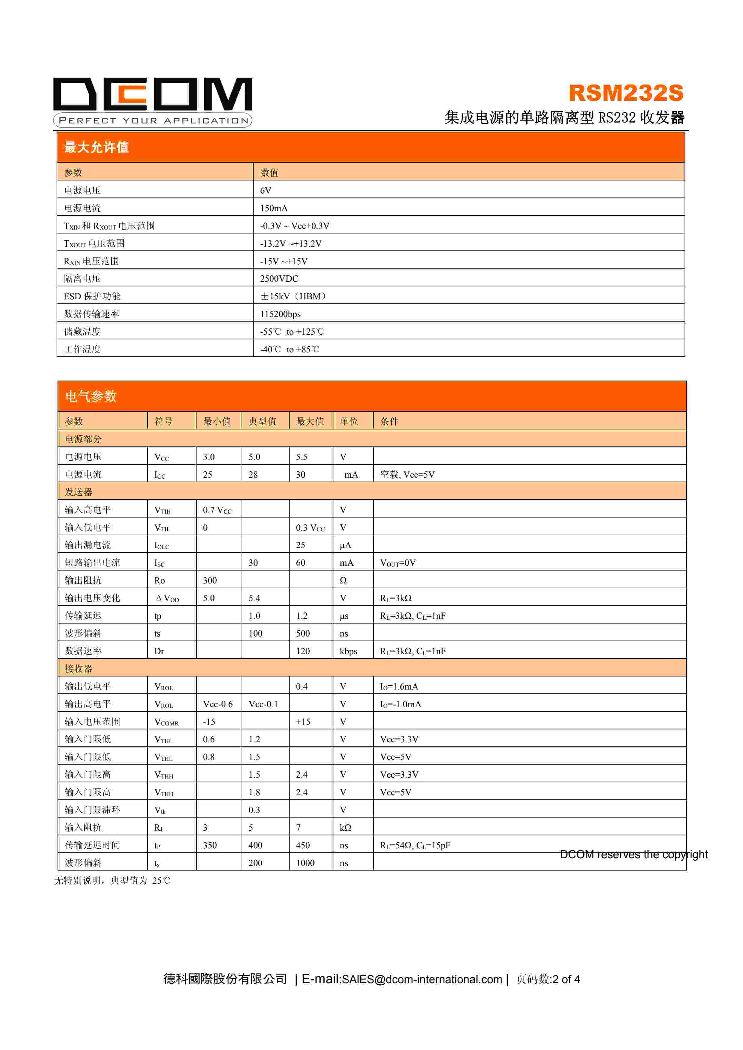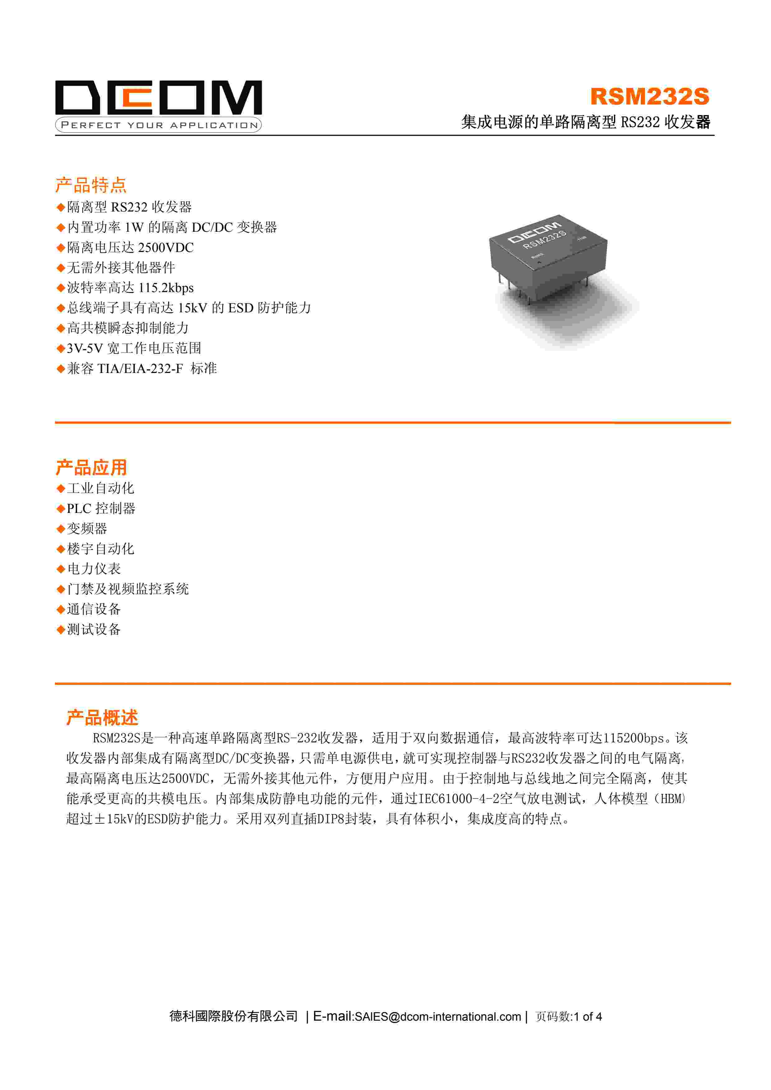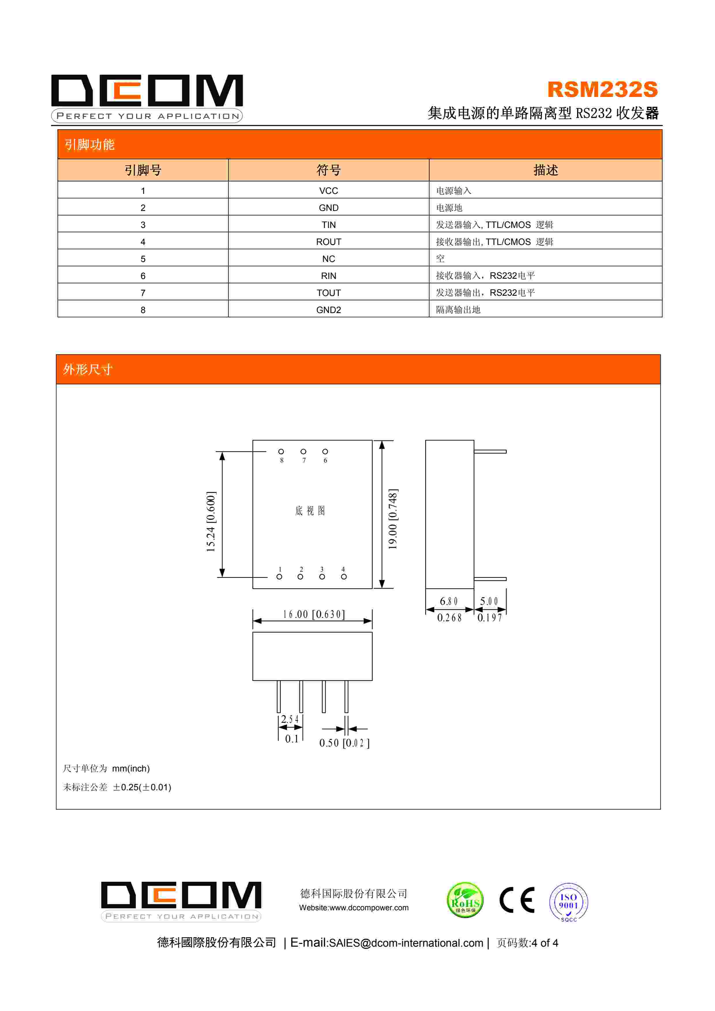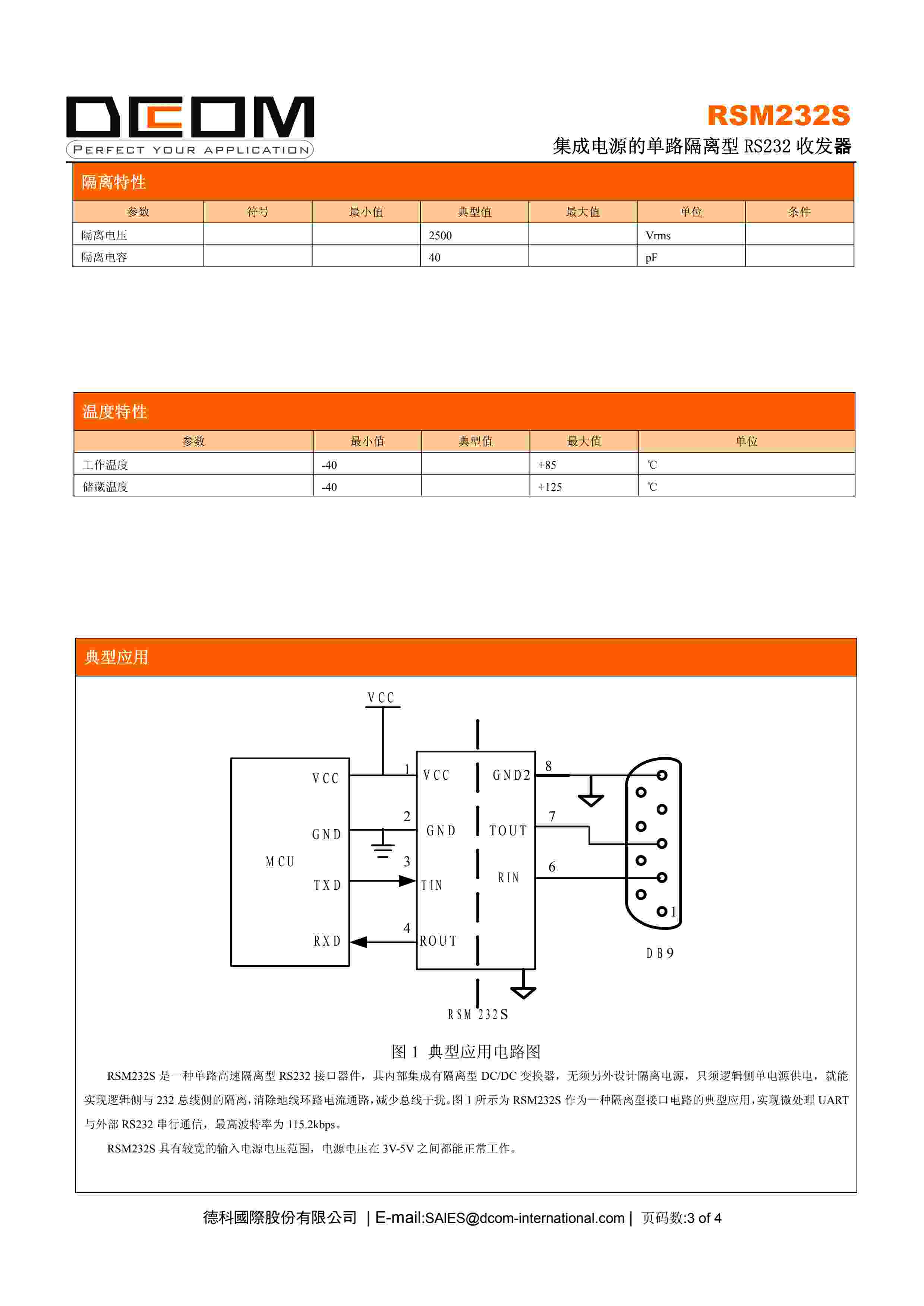 集成电源的单路隔离型 RS232 收发器